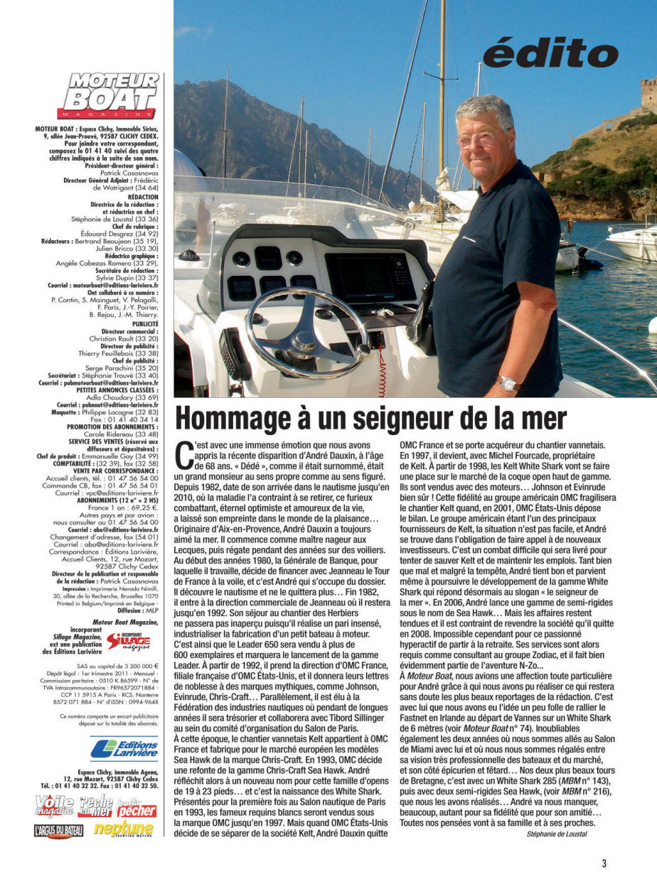 Edito de Moteur Boat Magazine de Mai 2011 avec la permission de Stéphanie De Loustal des éditions Larivière un article émouvant et tellement précis sur André Dauxin